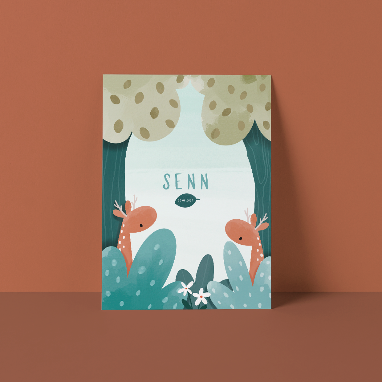 Een lief geboortekaartje van twee hertjes in het bos tussen de bomen. De kleuren kunnen aangepast worden.