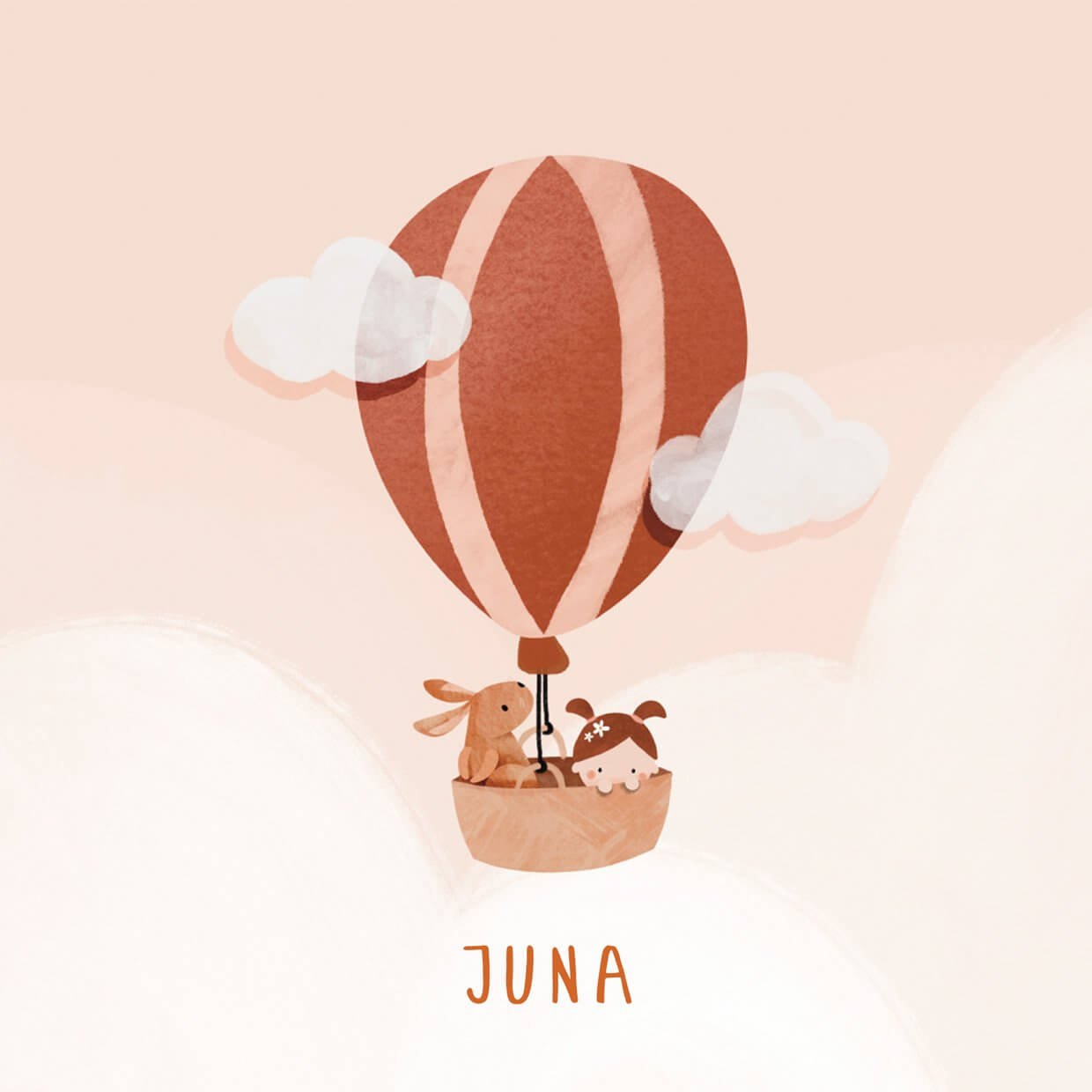 Een lief geboortekaartje van een meisje met een konijn in een luchtballon tussen de wolken. Speciaal voor kleine avonturiers!
