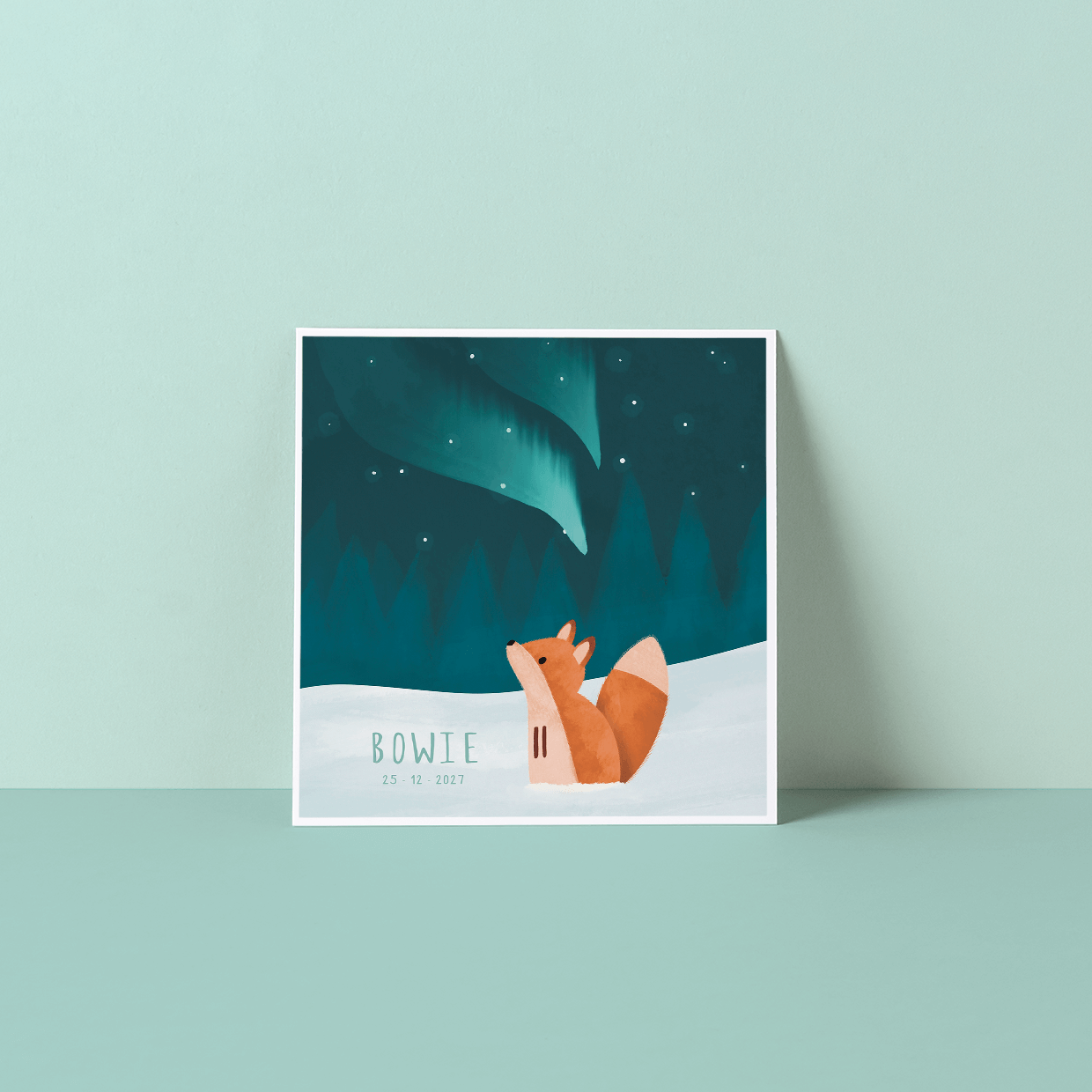 Een magisch kaartje van een vosje wat het noorderlicht bewonderd! De naam en sterren kunnen ook in goud- of zilverfolie gedrukt worden voor een extra sprankelend effect.