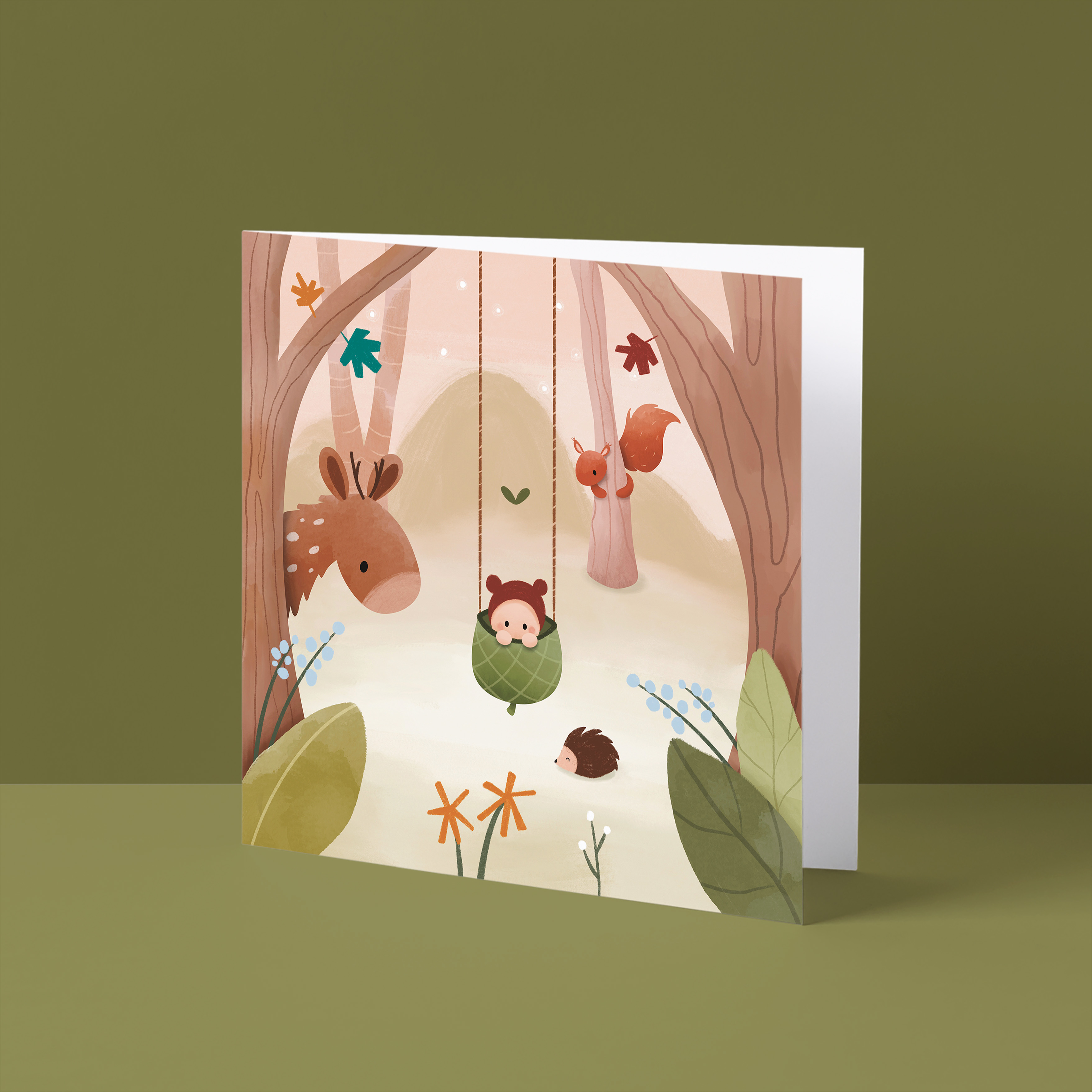 Een aandoenlijk kaartje voor een pasgeboren kindje in het bos. Perfect voor een geboorte! Een hertje, eekhoorn en egel zijn blij dat het kindje er is.