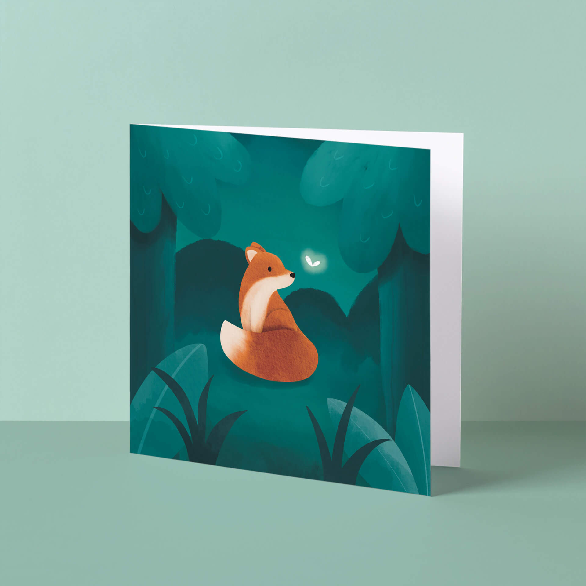 Een sfeervol kaartje van een vosje met een lichtgevend hartje in het bos in de nacht. Voor een geboorte, troost of zomaar een lieve wens!